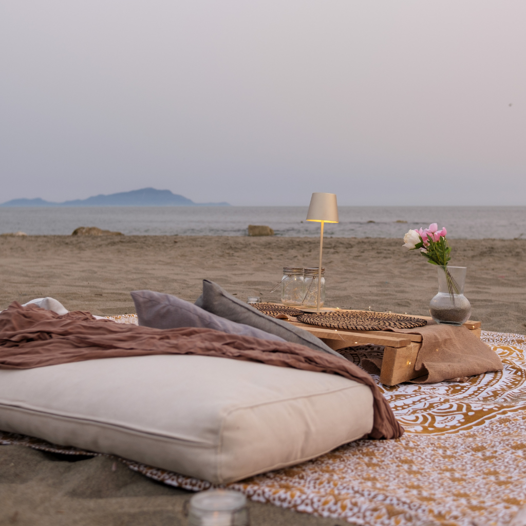 Se stai cercando un’idea romantica e d’effetto, eccola qui: una cena o un picnic direttamente in riva al mare, tra lucine, onde e sapori che parlano di amore.
